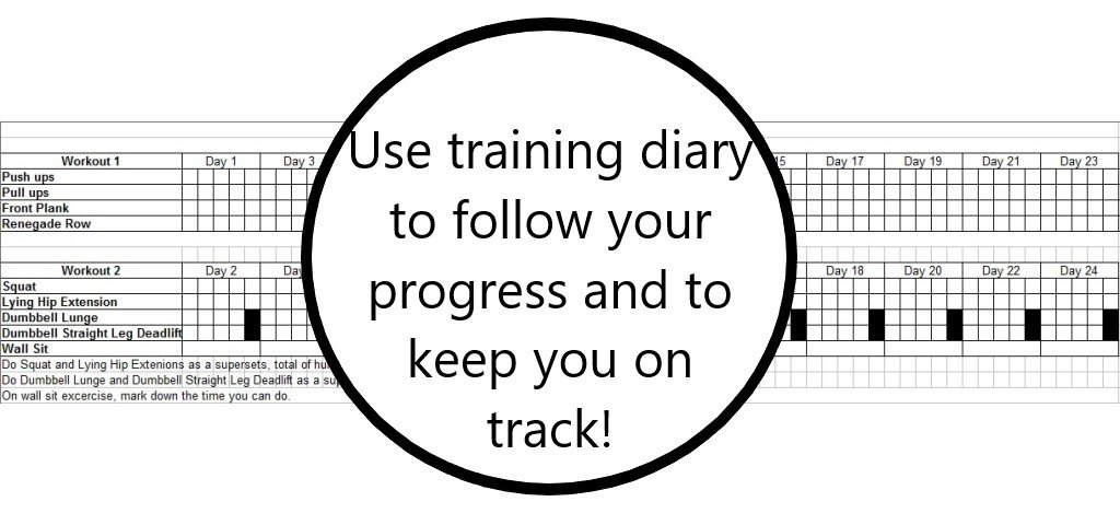 If you want to save your time and support this site, you can buy a training diary below (printable image and excel sheet). By using training diary, you can track your progress and maintain your motivation and you don’t need to remember the exercises by heart.